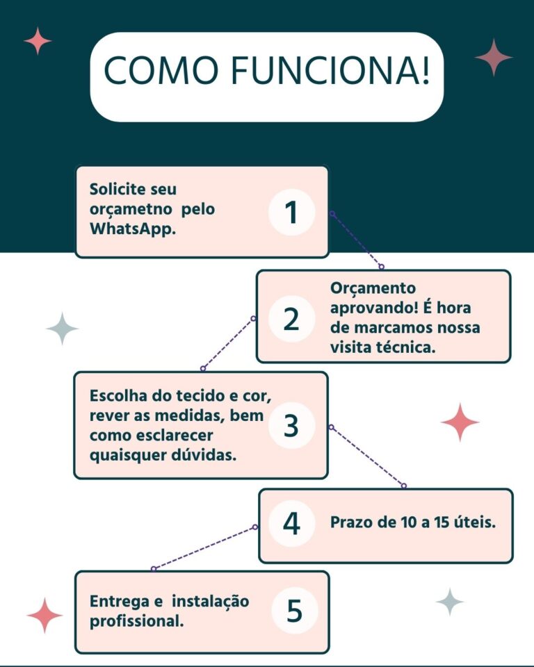 Orçamento rápido via WhatsApp, sem compromisso, agendamento de visita técnica, escolha do tecido, cor e modelo, tudo para sua comodidade.